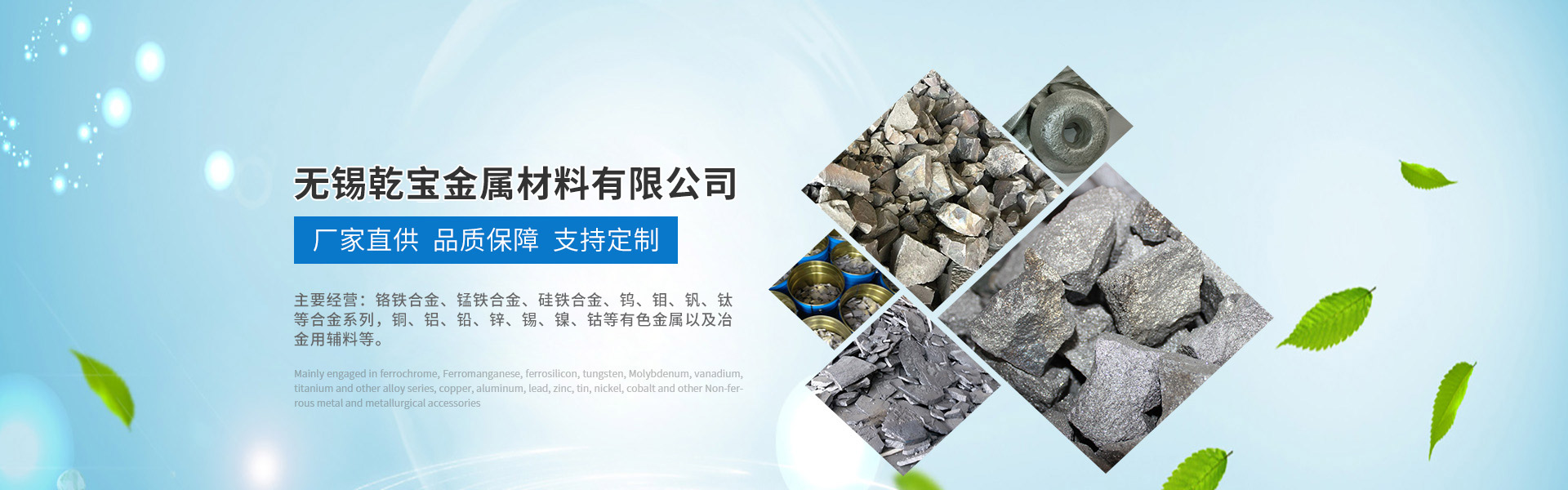 主要經營鉻鐵合金、錳鐵合金、硅鐵合金、鎢、鉬、釩、鈦等合金系列, 銅、鋁、鉛、鋅、錫、鎳、鈷等有色金屬以及冶金用輔料等